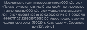 В частном центре Стукаловой гарантируют медицинскую помощь по индивидуальным схемам, составляемым профессиональными психиатрами-наркологами с опытом от 10 лет.